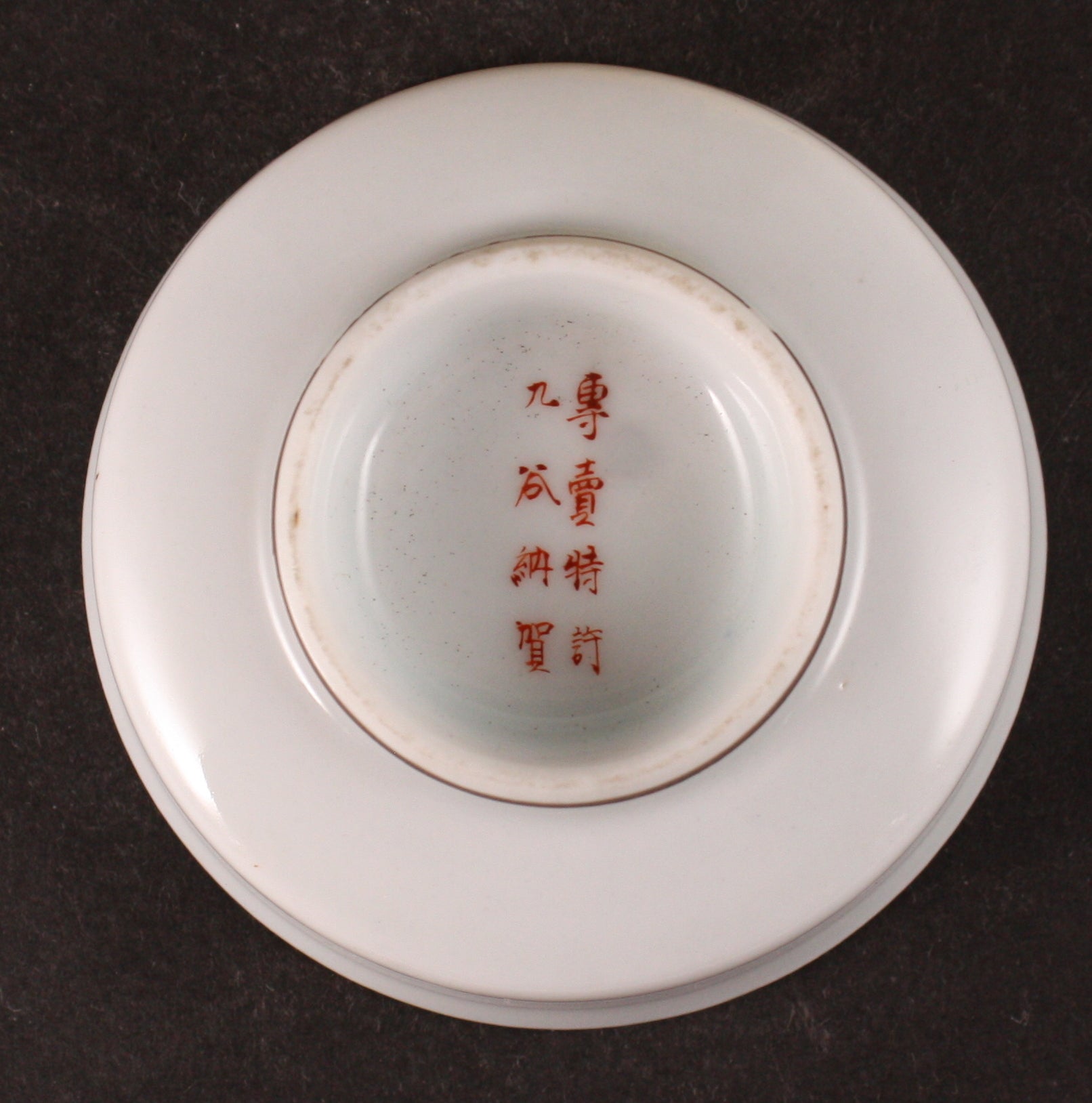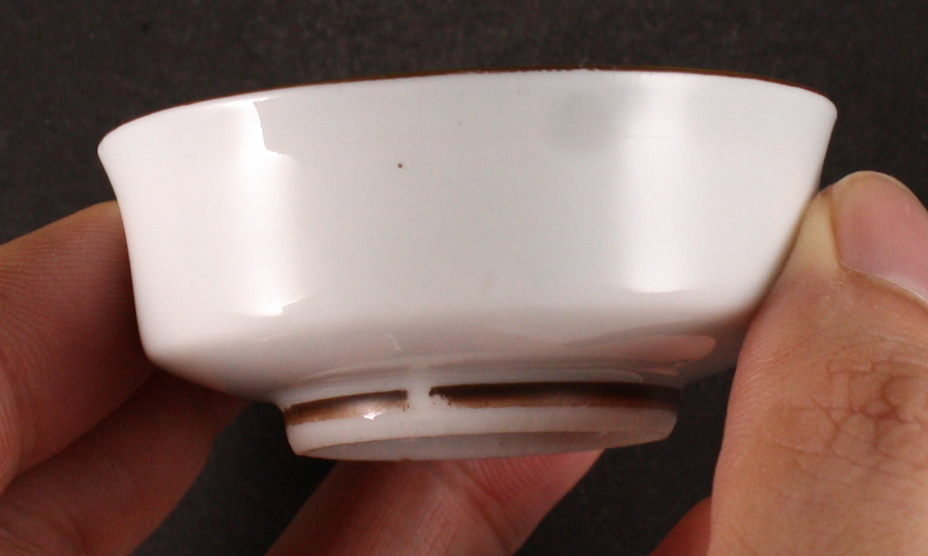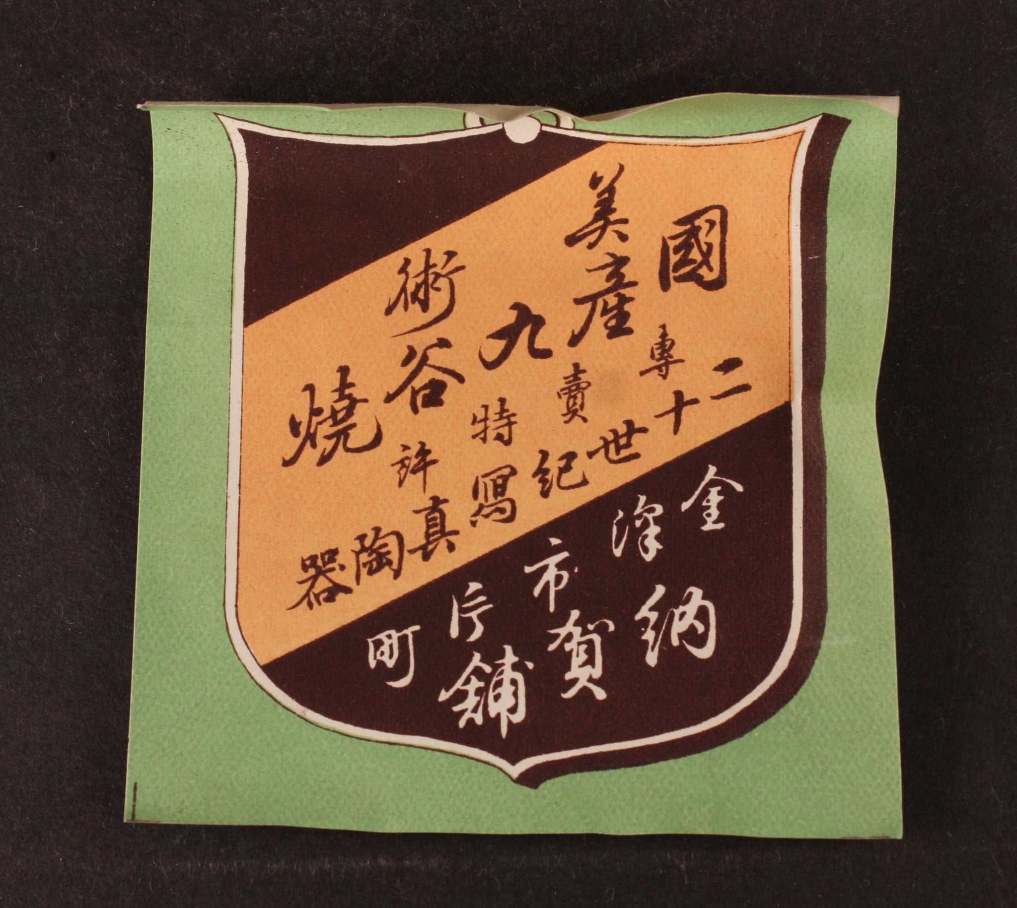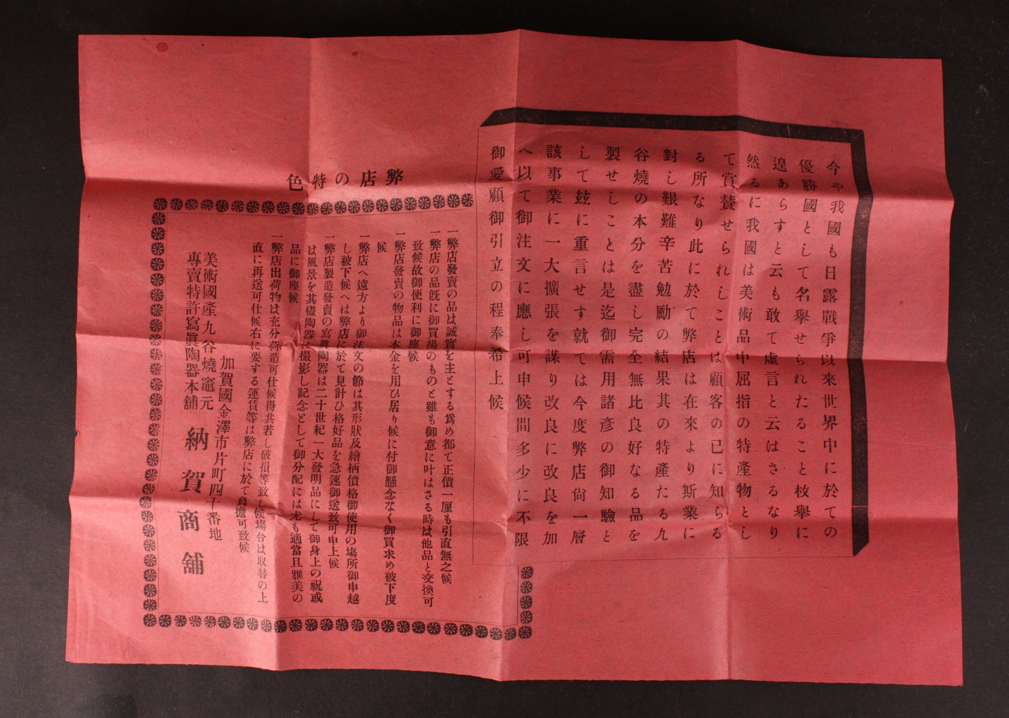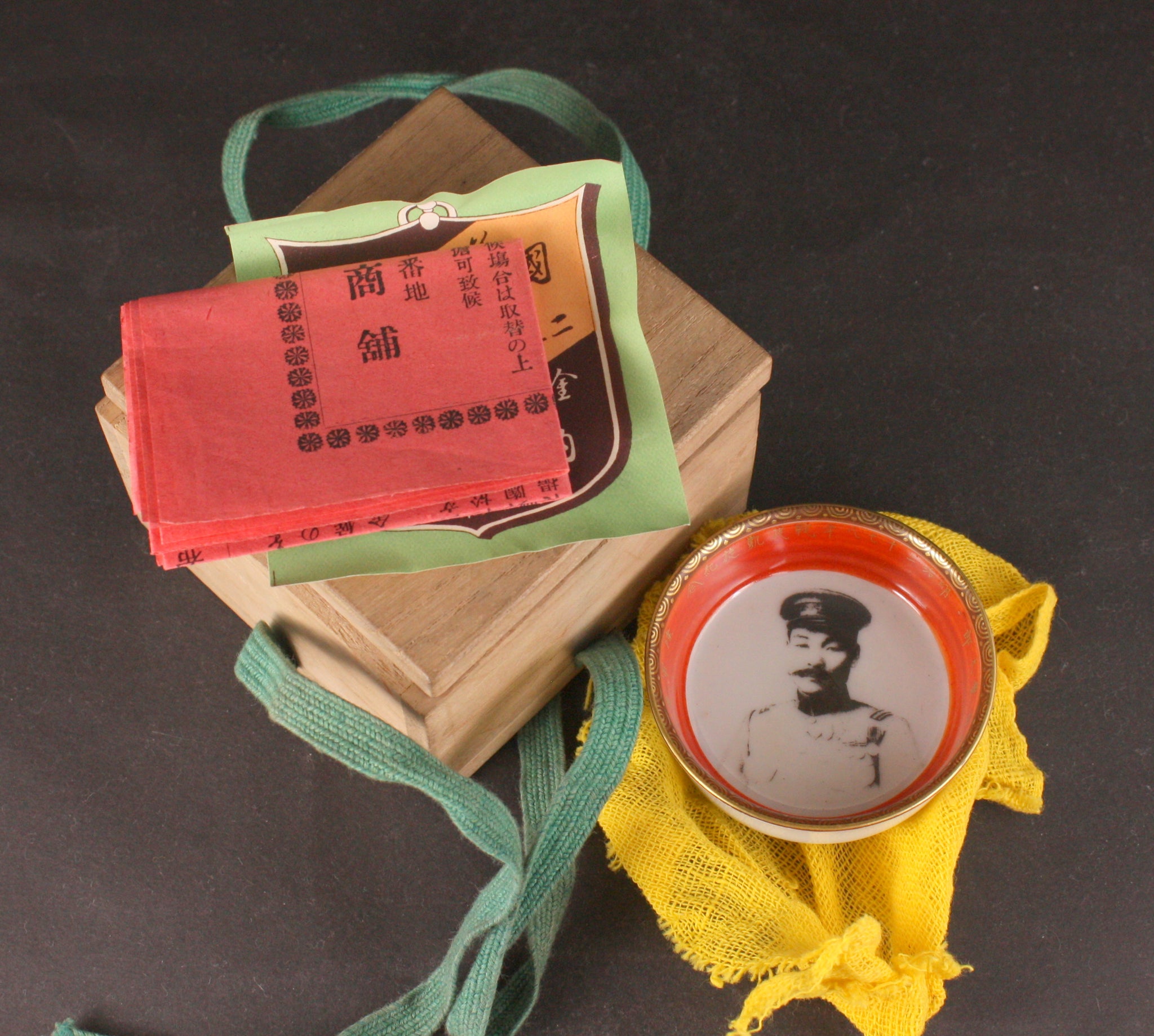 This is an antique Japanese military sake cup, made in a very unique photo transfer style - except instead of generals, this is a personal cup. The photo is an officer, and the words around the rim are "Meiji 37/38th Years War Victorious Return Commemoration" "Army Infantry Lieutenant 7th Rank, 5th Class honors, 5th class Golden Kite" and the soldier's full name Fukuda Toyotaro. The words on the back are "Sole sale permission" "Kutani Naka" - the maker's name. The cup comes in original wooden box with an advertisement for the shop (green) and also a description of the shop in red. The red pamphlet is basically about how Japan has become an equal among nations with their victory in the Russo Japanese war, how their shop works really hard to make the best souvenir, and how they're trying to expand their business. The "specialties" of the shop is listed on the left, such as the "20th century's great invention - the photo transfer porcelain". They have some kind of monopoly as they have a patent on this technology, and the shop was based in Kanazawa - the heart of Kutani-ware.